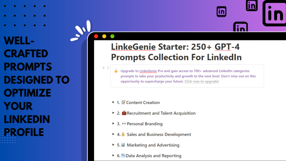 LinkeGenie is the ultimate digital product for anyone who wants to get the most out of LinkedIn. Our product provides you with proven prompts and strategies for eight different LinkedIn categories in the starter version and twenty in the pro version, including content creation, recruitment and talent acquisition, personal branding, sales and business development, marketing and advertising, data analysis and reporting, networking and relationship building, industry research and trend analysis, and much more.